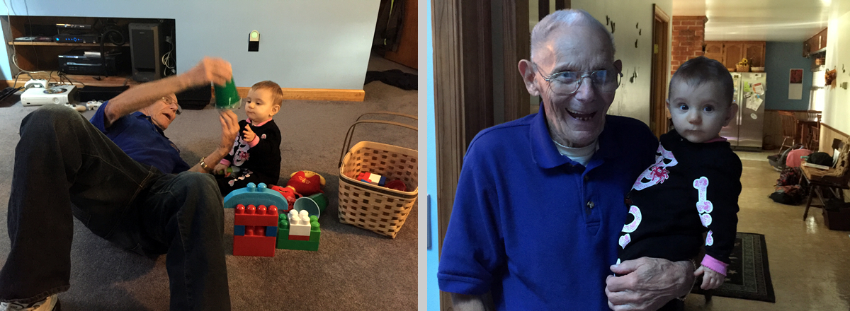 Having some fun and learning outdoors (Ava "Rose" at 9 months old). Wally is behind the rail watching over her. December 27, 2015 Pop pop time. Left: November 8, 2015 Right: December 25, 2015 Playtime! October 8, 2015 Ava "Rose" (granddaughter) was a good pass time for Wally. Always enjoyed her company and always made him smile. September 6, 2015