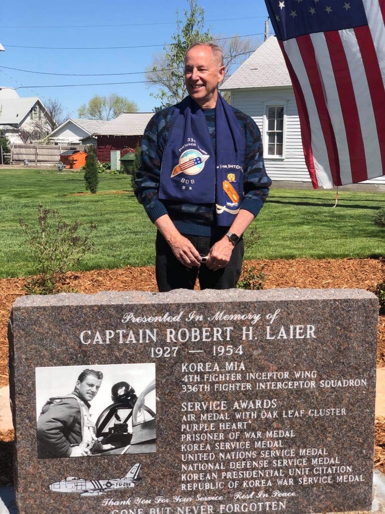 Capt. Robert Laier - photo from his son Richard. . Richard Laier unveils the new monument to his father, Robert Laier, during the ceremony held on Tuesday. / C-H photo • Brian Neben Full article/source: https://lexch.com/news/cozad-honors-native-son-robert-laier-who-was-shot-down-and-killed-during-the-korean/article_1a782986-af3a-11eb-8fc2-d3c1e8e9d589.html A picture of Richard wearing his fathers scarf in front of the memorial. An incredible photo. Thanks for sharing!