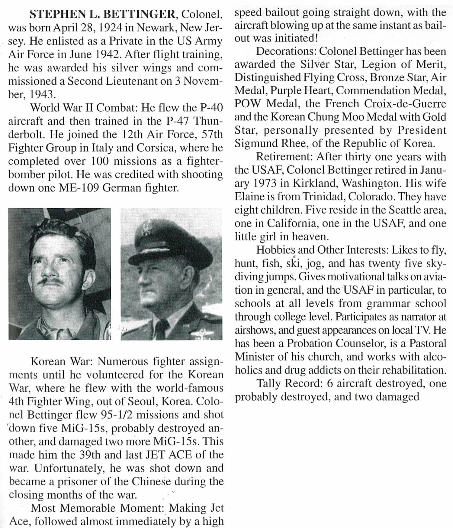 (The 4th Fighter Wing in the Korean War - Larry Davis) (4th Fighter Interceptor Wing yearbook - 1953) F-86 Sabre (by Aircraft Films - DVD 2004) Visit migkill.com for more information on Stephen Bettinger. They have an excellent video of his life.